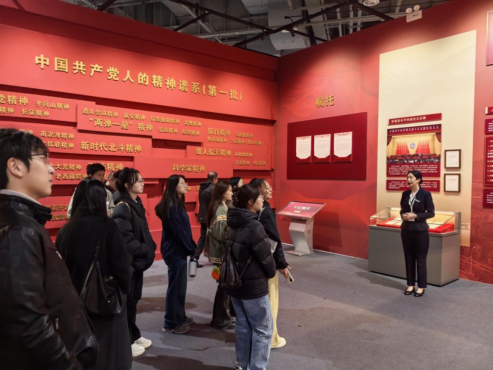 在中国科学家博物馆,同学们跟随讲解员步伐,重点参观“共和国的脊梁——科学家主题展”。展厅内,100余位科学家的手稿、科研仪器等300余件实物展品,串联起新中国科技发展的艰辛历程。从“两弹一星”元勋们的手稿中,大家读懂了老一辈科学家“干惊天动地事,做隐姓埋名人”的赤诚;在“新时代科技创新”展区,5G技术、特高压设备等模型前,青年党员们热议科技自立自强的时代意义。这些展品不仅是科技史的见证,更是科学家精神的具象化表达。