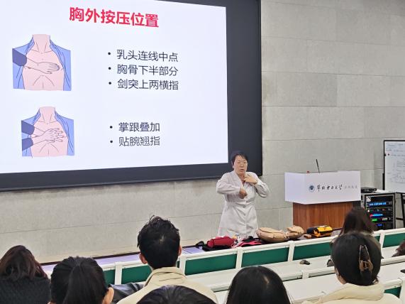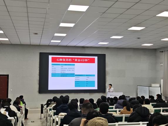 本次讲座内容兼具专业性与实用性,贴合校园生活实际需求。在《现场应急救护》环节,副主任医师尹秀秀结合近年多起突发猝死的真实案例,强调了掌握现场急救技能的重要性。她围绕成人心肺复苏、AED自动体外除颤器操作、海姆立克急救法三大核心内容展开详细讲解,清晰梳理了心肺复苏“黄金4分钟”的关键原则,分步演示了环境评估、意识判断、胸外按压、人工呼吸的标准操作流程,重点强调了高质量胸外按压的深度、频率等核心要点。同时,尹医师还现场讲解了AED的使用步骤及海姆立克急救法的操作技巧,并明确了《中华人民共和国民法总则》中关于紧急救助的法律保障,消除了同学们不敢在关键时刻为他人施救的顾虑。