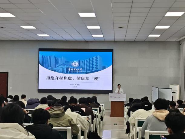 随后,主治医师元沙沙带来了《普及健康生活方式》的专题分享,元医生从肥胖现状与危害、饮食控制、合理运动、避误区树心态四个方面,引导同学们树立正确的健康观念。并通过BMI指数计算、热量需求公式等实用知识,为同学们讲解了科学控重的方法,推荐了校园适宜的有氧运动与力量训练方式,提醒同学们规避过度节食、单一食物减肥等误区,同时分享了21天养成良好生活习惯的具体建议,倡导大家做到“管住嘴、迈开腿”,保持规律作息与均衡饮食。