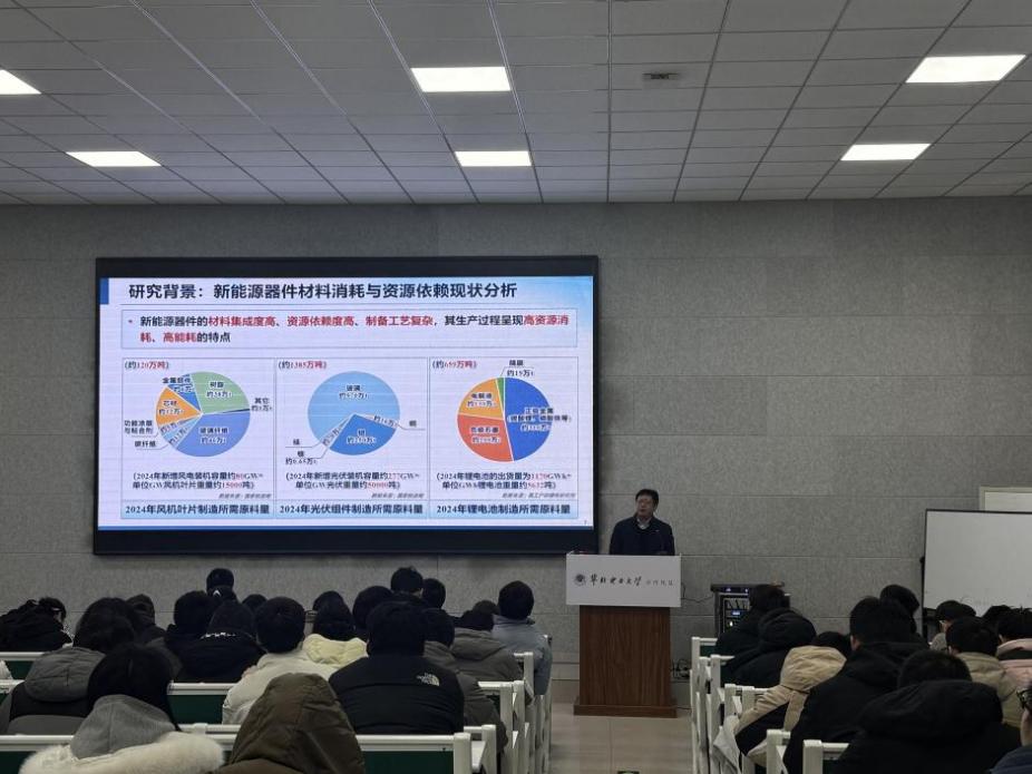 报告会中,陆强教授系统阐述了退役新能源器件热解回收技术与装备研发及应用领域的发展现状,进一步剖析了风电叶片、光伏组件及动力锂电池等的回收技术和面临的核心难题,阐释了退役新能源器件研发应用的实践成果,为在场师生呈现了一场兼具前沿性与实践性的学术盛宴。