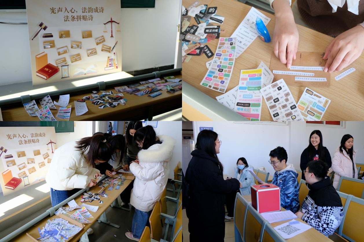 本次活动以“趣味互动+知识传播”为核心,创新设置三大特色环节,让法治教育从“被动听”变为“主动学”。“法条拼接诗创作”环节中,同学们从宪法条文语料库中选取关键词句,将严谨的法律规范转化为诗意表达,让宪法精神在文学创作中焕发青春活力;“宪法知识闯关”现场,选手们围绕宪法地位、公民权利义务、国家根本制度等核心内容从容应答,在答题比拼中深化对宪法原则与精神的理解;“emoji猜法律名称”则以生动形象的符号谜面,激发同学们的探索热情,让抽象的法律概念变得直观易懂,现场氛围热烈欢快。活动为参与者精心准备了钥匙扣、冰箱贴、书签等纪念礼品,同学们在轻松愉悦的氛围中既收获了实用礼品,更提升了法治素养,切实感受到宪法与日常生活的紧密联系。